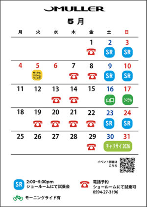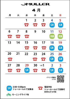 カレンダーの☎マークの日が試乗可能な日になります。ご希望の日時をご連絡ください。(☎0594-27-3196)