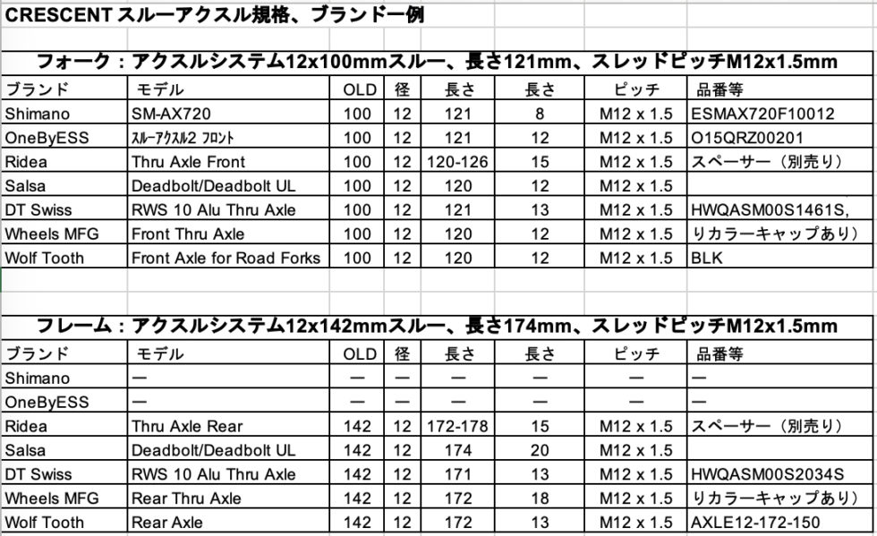 CRESCENT スルーアクスルの規格、推奨ブランドの一例